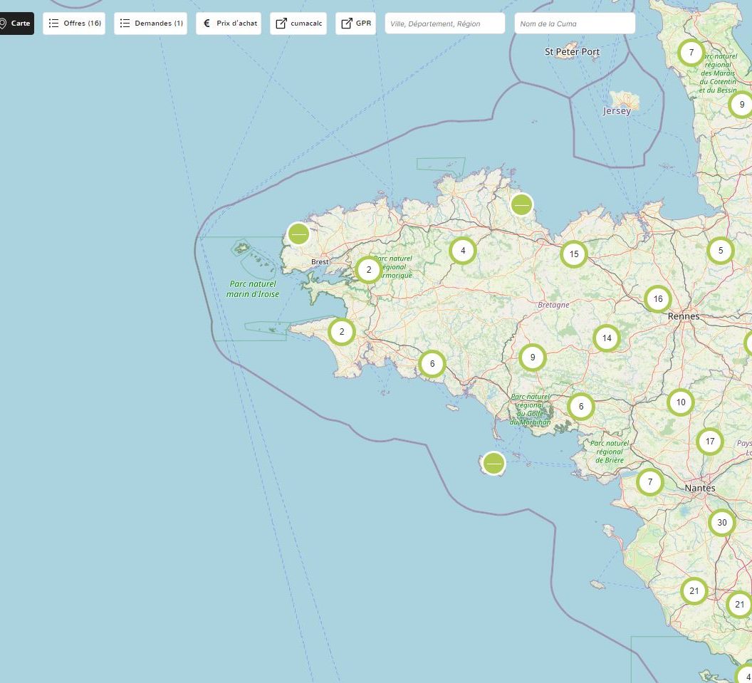 Pour localiser toutes les moissonneuses (et tous les autres matériels) en cuma en France https://link.mycuma.fr/carte?equipment_type=0723