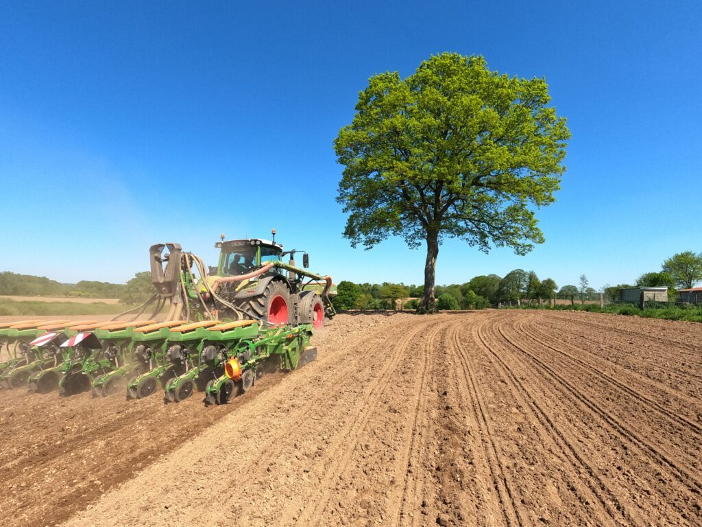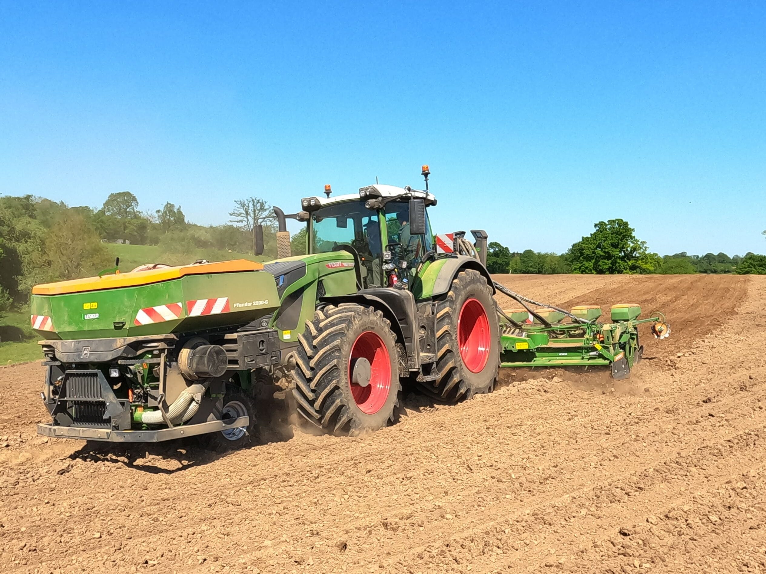 L’ensemble se compose de la herse rotative KG 6 m, du semoir monograine précis PRECEA 8 rangs et de la trémie frontale FTENDER de 2200 litres, le tout de la marque Amazone. Un tracteur Fendt 936 emmène le tout. Il est équipé des standards actuels de la haute technicité comme l’autoguidage RTK (le chauffeur conduit en bout de champ seulement), la coupure rang par rang, le télé-gonflage et un enrouleur avec soufflette pour l’entretien en autonomie.